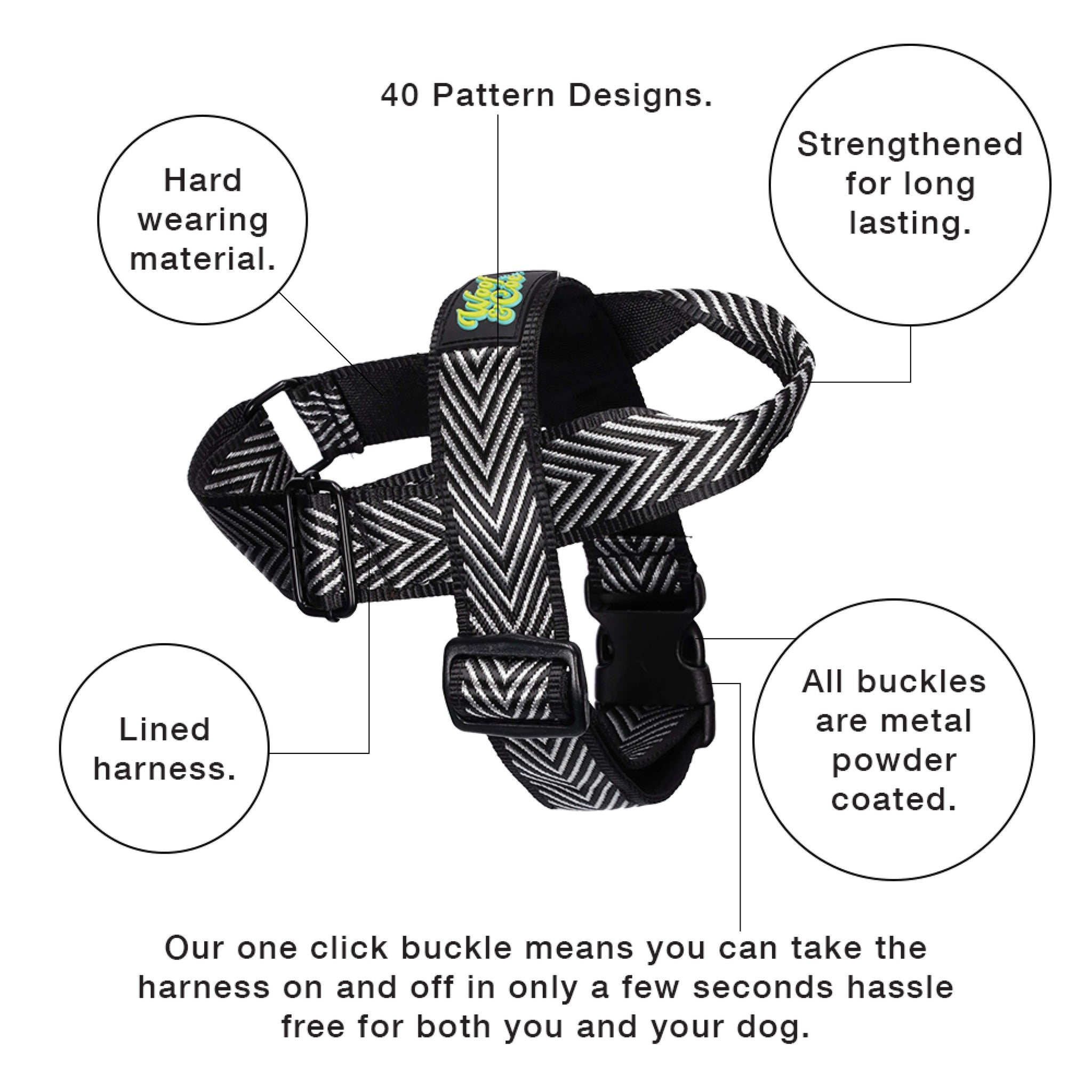 Our one click buckle means you can take the harness on and off in only a few seconds hassle free for both you and your dog